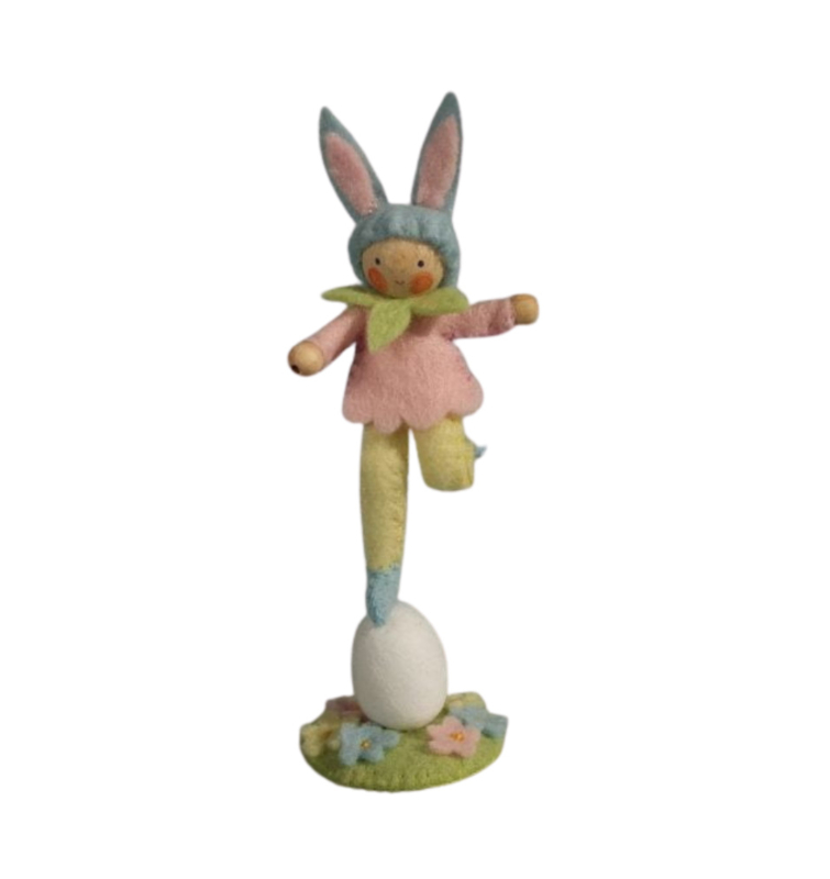 Een vrolijk konijntje van ongeveer 9cm dansend op een eitje.