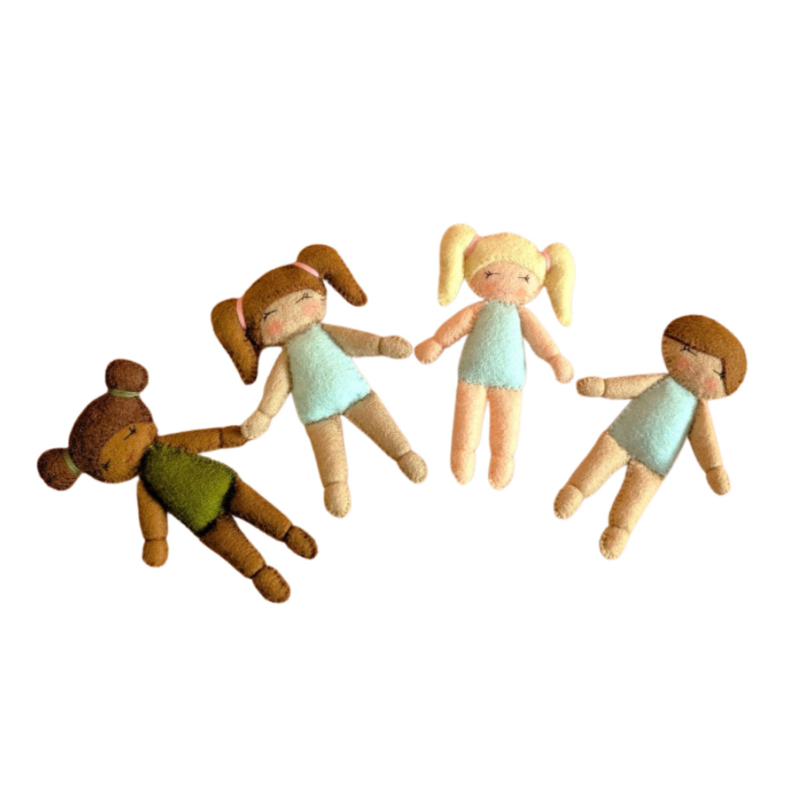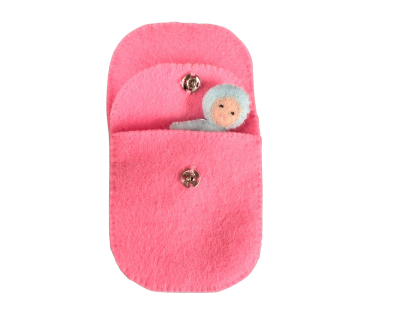 Het pakketje bevat vilt voor het blonde poppetje met het roze slaapzakje zoals op het voorbeeld. Maar op het patroon staan ook nog wat andere kapsels een beertje in plaats van het poppetje. Heel leuk om er nog wat andere poppetjes bij te maken.